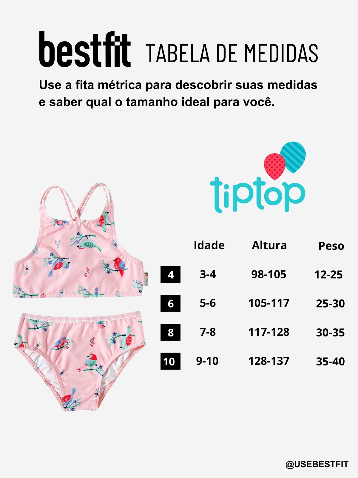 O Top com Calcinha Praia Kids Garden Rosa Elastano Proteção UV 50+ Tip Top é perfeito para acompanhar as pequenas em dias de sol, combinando charme, conforto e segurança. Confeccionado em tecido com elastano e tecnologia UV 50+, protege a pele delicada das crianças contra os raios solares enquanto garante liberdade de movimento. O conjunto traz uma estampa encantadora de passarinhos coloridos sobre galhos em tons suaves de rosa, com top de alças cruzadas nas costas e calcinha combinando. Ideal para meninas de 4 a 10 anos, é a escolha certa para um visual fofo e protegido durante o verão.