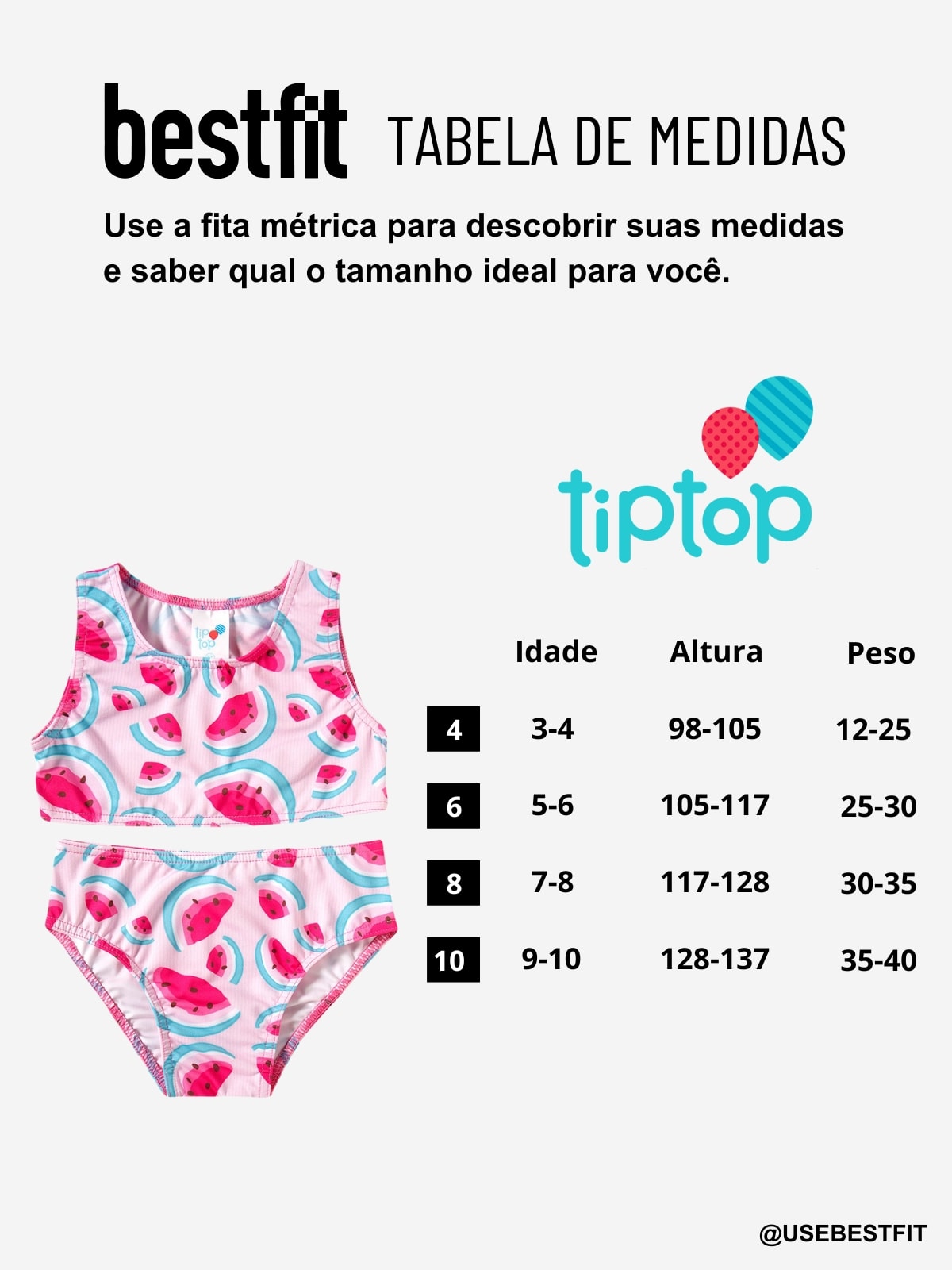 O Top com Calcinha Praia Kids Melância Rosa Elastano Proteção UV 50+ Tip Top é perfeito para acompanhar as pequenas em dias de sol, combinando charme, conforto e segurança. Confeccionado em tecido com elastano e tecnologia UV 50+, protege a pele delicada das crianças contra os raios solares enquanto garante liberdade de movimento. O conjunto traz uma estampa encantadora de passarinhos coloridos sobre galhos em tons suaves de rosa, com top de alças cruzadas nas costas e calcinha combinando. Ideal para meninas de 4 a 10 anos, é a escolha certa para um visual fofo e protegido durante o verão.