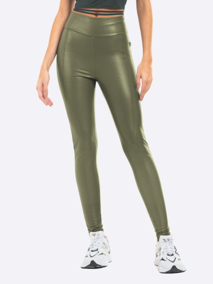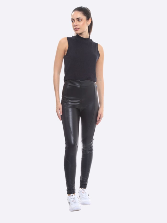 Modelo legging feminina. Courino felpado com leve brilho. Forro interno em malha plush. Cintura média com elasticidade. Sem bolsos. Caimento ajustado ao corpo.